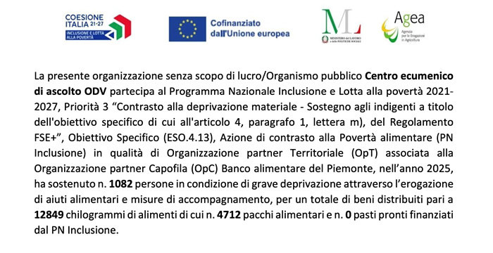 Il Centro Ecumenico d'Ascolto dal 1992 apre la porta a chiunque si trovi in difficoltà economica e non solo, offrendo un'opportunità di esporre i propri problemi e di avere un'accoglienza, un ascolto e un aiuto fraterno... LEGGI TUTTO